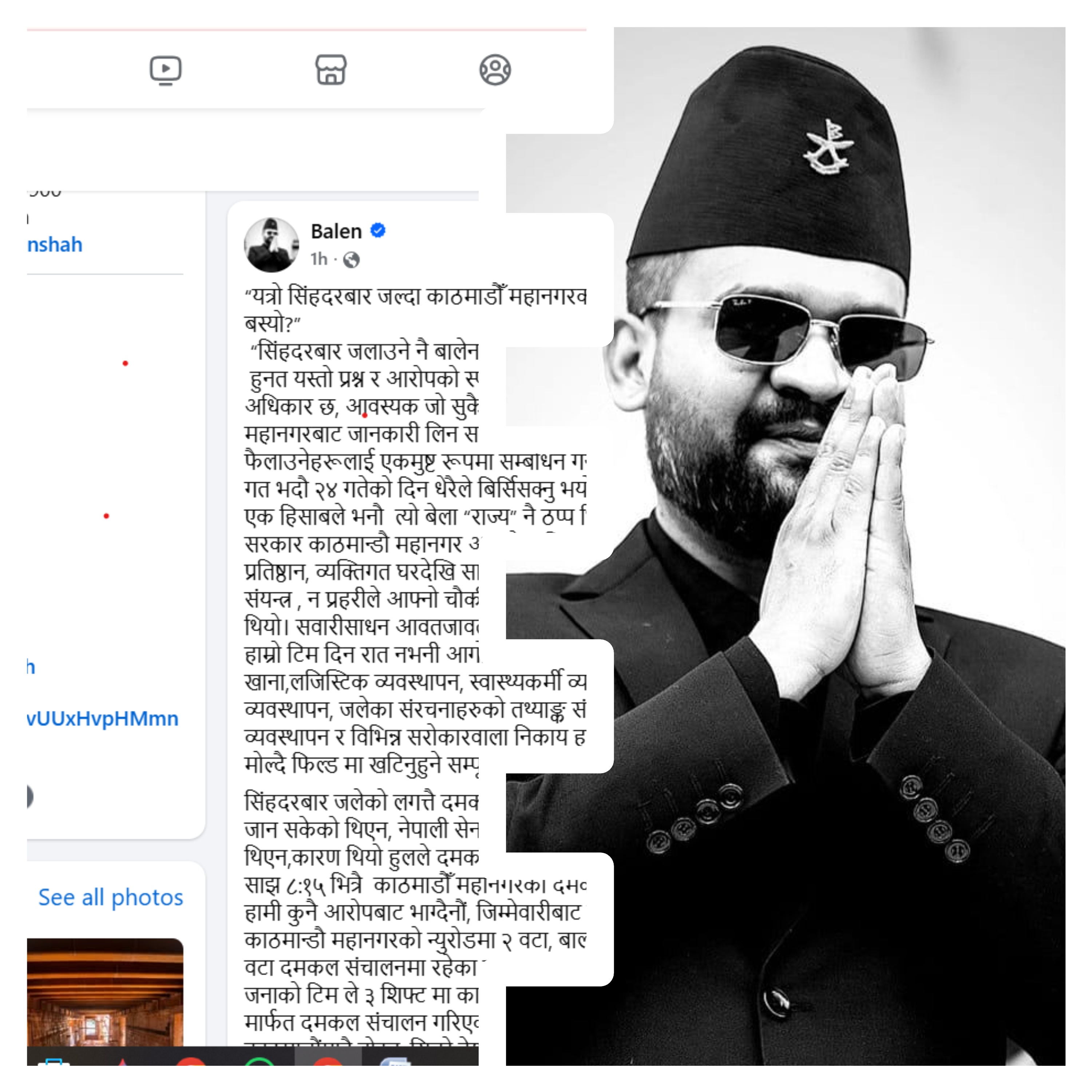 काठमाडौँ। गत भदौ २४ गते सिंहदरबारमा भएको आगलागीका विषयमा काठमाडौँ महानगरपालिका र नगर प्रमुख बालेन शाहमाथि लागेका ‘दमकल ढिलो पुग्यो’ र ‘आगो निभाउन सहयोग गरेन’ जस्ता आरोपहरूको महानगरले खण्डन गरेको छ। नगर प्रमुख बालेन शाहले फेसबुक मार्फत महानगरले एक लामो स्पष्टीकरण जारी गर्दै विषम परिस्थितिमा दमकल, स्वास्थ्यकर्मी र नगर प्रहरीको टिमले गरेको कामको विस्तृत विवरण सार्वजनिक गरेको हो।