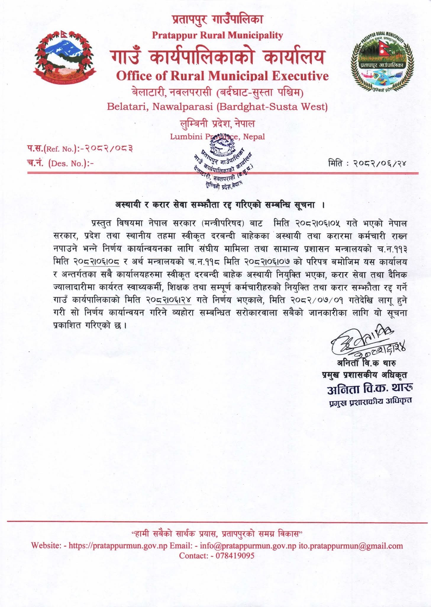 प्रतापपुर, नवलपरासी (बर्दघाट-सुस्ता पश्चिम)। पश्चिम नवलपरासी जिल्लाका स्थानीय तहमध्ये प्रतापपुर गाउँपालिका स्वीकृत दरबन्दी बाहेकका सम्पूर्ण अस्थायी र करार कर्मचारीहरूको सेवा समाप्त गर्ने पहिलो गाउँपालिका बनेको छ।