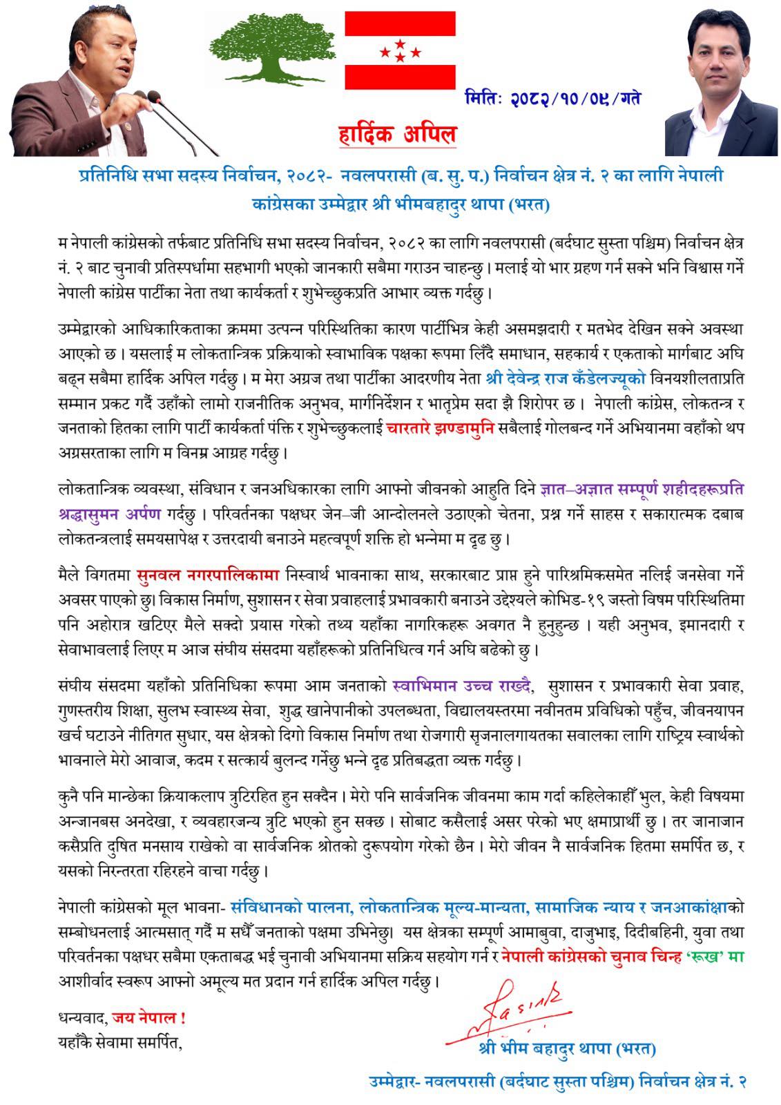 नवलपरासी । नेपाली कांग्रेसका नेता भीमबहादुर थापा (भरत) ले आगामी प्रतिनिधि सभा सदस्य निर्वाचनका लागि नवलपरासी (बर्दघाट सुस्ता पश्चिम) निर्वाचन क्षेत्र नं. २ बाट आफ्नो उम्मेदवारी घोषणा गर्नुभएको छ। एक सार्वजनिक ‘हार्दिक अपिल’ जारी गर्दै थापाले पार्टीको आधिकारिक उम्मेदवारका रूपमा आफू चुनावी मैदानमा उत्रिएको जानकारी गराउनुभएको हो।